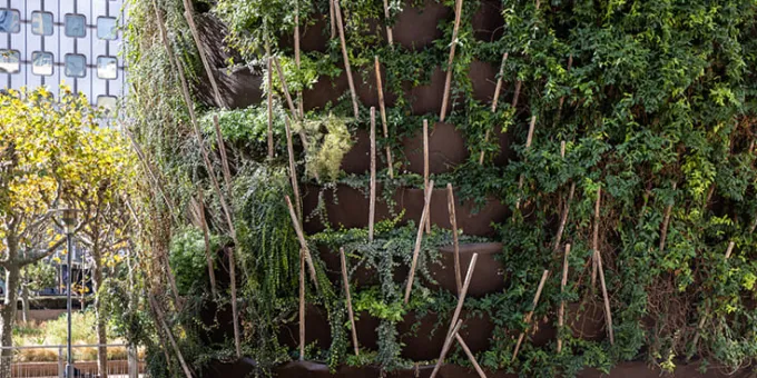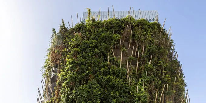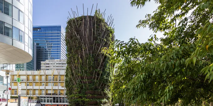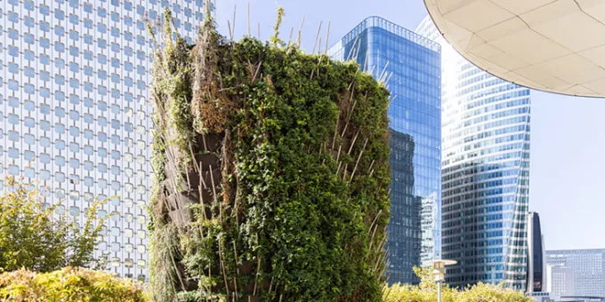 Dès sa réalisation dans les années 70, l’utilitaire cheminée d’aération des sous-sols de l’esplanade a été recouverte d’une fresque. Mais son concept finit par devenir anachronique au vu de son environnement immédiat, et notamment de son prestigieux voisin : l’ensemble Cœur Défense. Unibail, le promoteur de l’opération, a donc décidé de mettre en place un projet plus contemporain, devenu une œuvre d’art alliant le cuivre, le bois et des centaines de plantes.