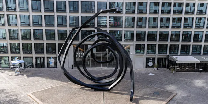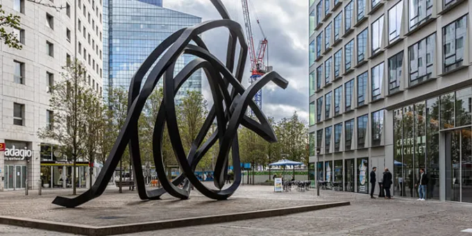 Représentative de la vision de l’artiste, cette œuvre, installée en 1988 dans le quartier Michelet, offre des lignes non définies, variables selon les points de vue et n’offrant aucun repère dans l’espace. Elle explore le concept de contraste entre l’œuvre et son contexte : la force visuelle de celle-ci se trouve dans l’examen de représentations géographiques et arithmétiques qui transforment l’atmosphère cet espace public. Sculpture monumentale de 12 mètres de haut, cette œuvre fait partie d’une suite de réalisations dont la (non) logique a inspiré le nom de Doubles lignes indéterminées.