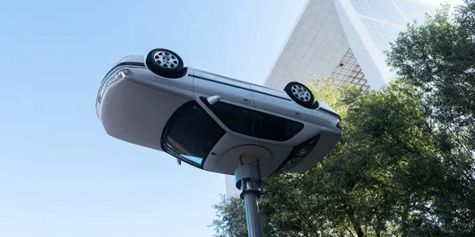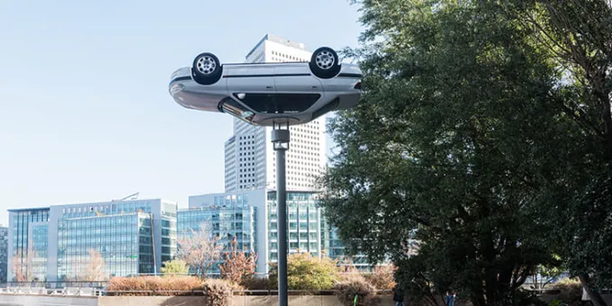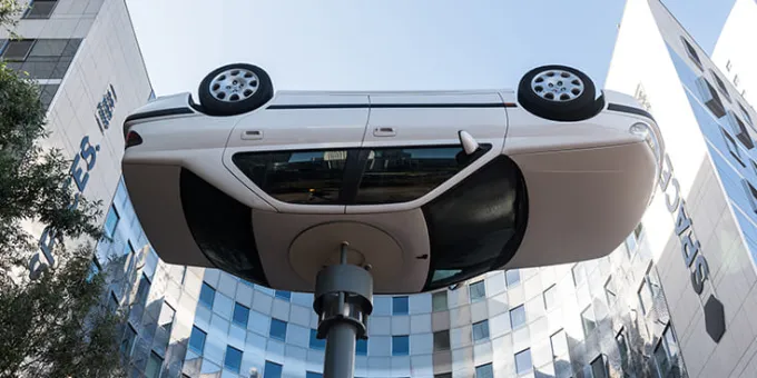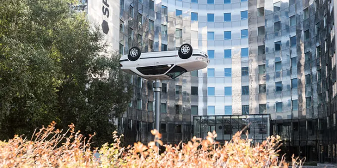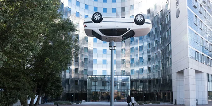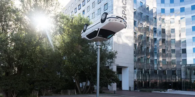 Le moins que l’on puisse dire, c’est que le nom de cette œuvre est représentative de la réalité ! La voiture lampadaire est une Peugeot 406 blanche renversée sur son toit et juchée en haut d’un candélabre. Difficile à louper, l’œuvre créée spécialement par Benedetto Bufalino pour l’édition 2019 des Extatiques, a depuis officiellement rejoint la collection d’art de Paris La Défense. Disposée à l’origine près de la cheminée Le Moretti, La voiture sur le lampadaire a déménagé, le 12 juin 2020, dans le quartier Valmy, entre l’immeuble Spaces et la Grande Arche. L’œuvre de Benedetto Bufalino interagit avec l’architecture et les usagers et participe à la vie du quartier en illuminant la voie publique à la tombée du jour.