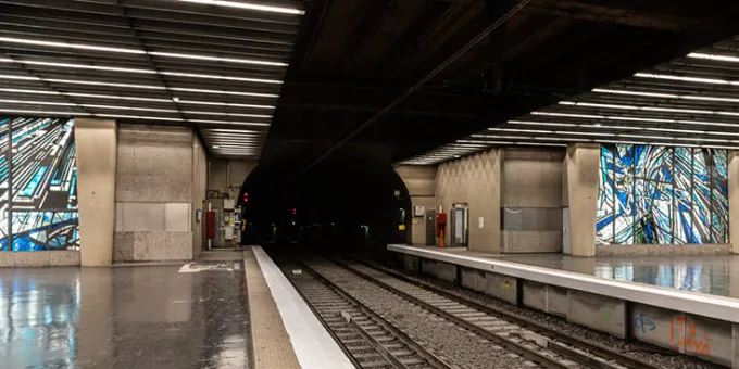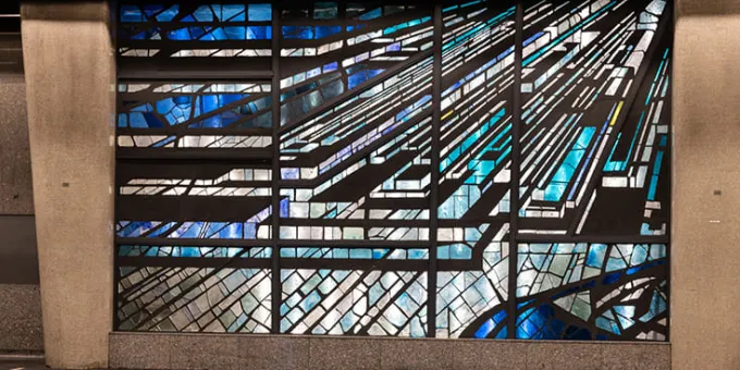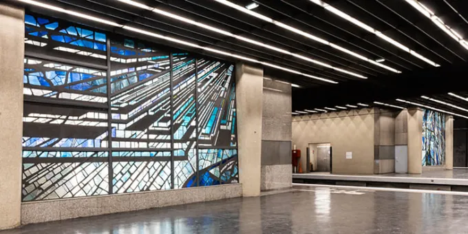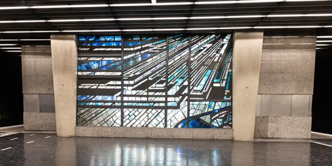 Un mur de lumière dans un antre souterrain. L’audace artistique de cette idée saute aux yeux des passants de la station RER Grande Arche de La Défense. Ils découvrent ainsi une déclinaison de couleurs et de lumière couvrant un large vitrail de 18 mètres de long sur 4 mètres de hauteur. Du blanc bleuté aux bleus de cobalt, outre-mer et turquoise, les formes diffusent leurs ondes colorées dans une étonnante symphonie.