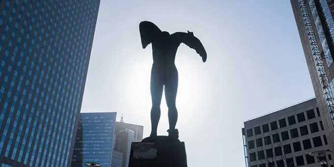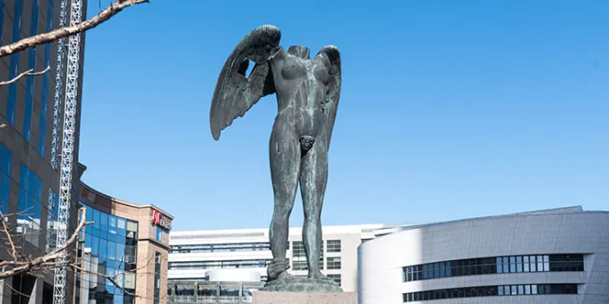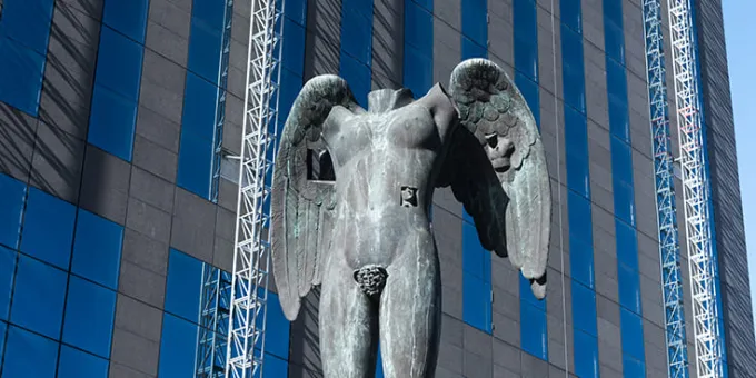 Cette œuvre conjugue mémoire de l’antique et traitement contemporain. Ses proportions sont idéales, mais Ikaria a été délibérément décapitée et clouée au sol par une main qui semble l’empêcher de prendre son envol, malgré ses ailes déployées. À travers son œuvre, Igor Mitoraj n’a de cesse d’exprimer la nature humaine et son imperfection le corps humain, sa beauté et sa fragilité. Souvent de grande taille, à l’instar d’Ikaria, en bronze, et ses six mètres de haut, ses sculptures captent le regard dans des lieux publics aujourd’hui disséminés dans de nombreuses villes en Europe, aux États-Unis ou au Japon.