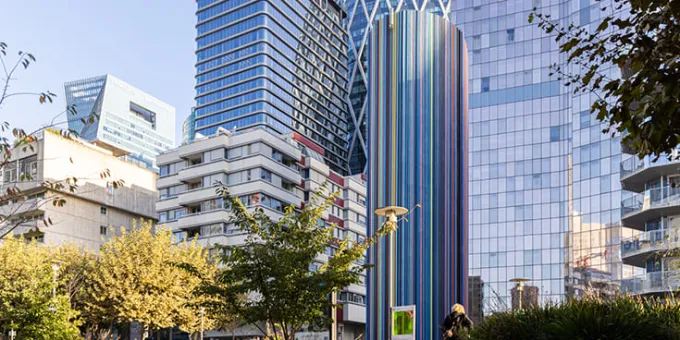 L’imagination foisonnante de Moretti a pu s’exprimer librement, transformant une cheminée d’aération de 32 mètres en œuvre d’art insolite, aux couleurs éclatantes. En utilisant 672 tubes en fibre de verre de 2 à 30 centimètres de diamètre, peints de 19 couleurs différentes, il revêt l’intégralité de la surface pour mieux souligner le volume tout en verticalité, offrant une dynamique insolente et joyeuse.