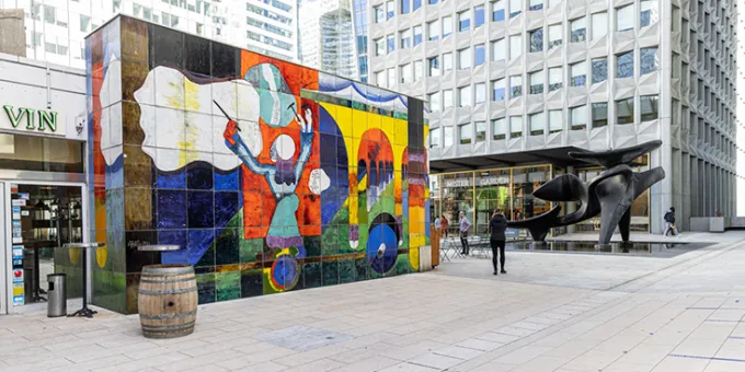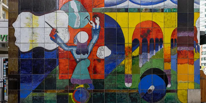 Par son thème, son style inimitable et la force éclatante des couleurs, cette fresque symbolise parfaitement le monde fantastique de l’artiste. Elle a été réalisée en 1969, à l’aide d’émaux sur lave.