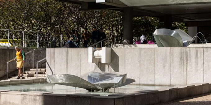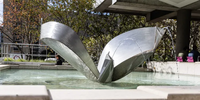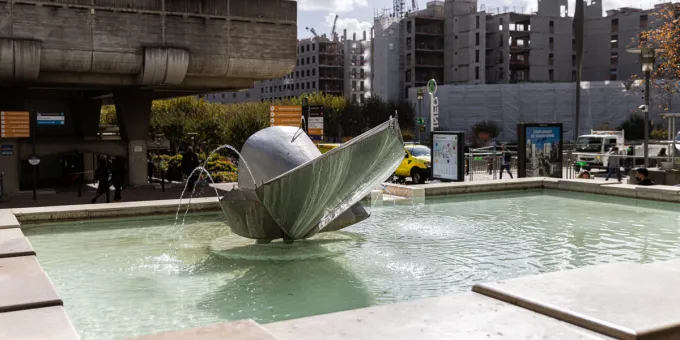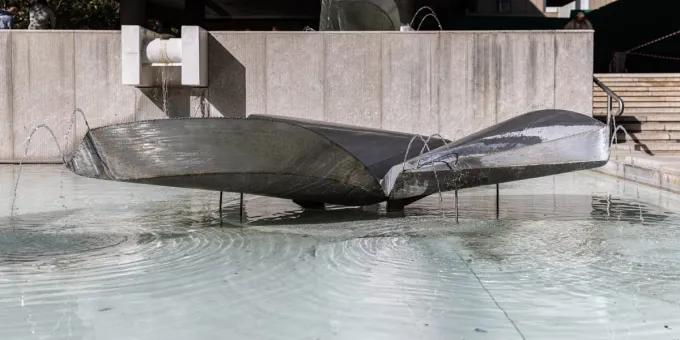 Cette sculpture monumentale qui orne les deux fontaines est réalisée en acier inoxydable, matériau de prédilection de Philolaos. On y décèle une forme de fleur dans un bassin, clin d’œil moderne à Monet et hommage à une nature qui semble, coûte que coûte, reprendre ses droits sur le béton.