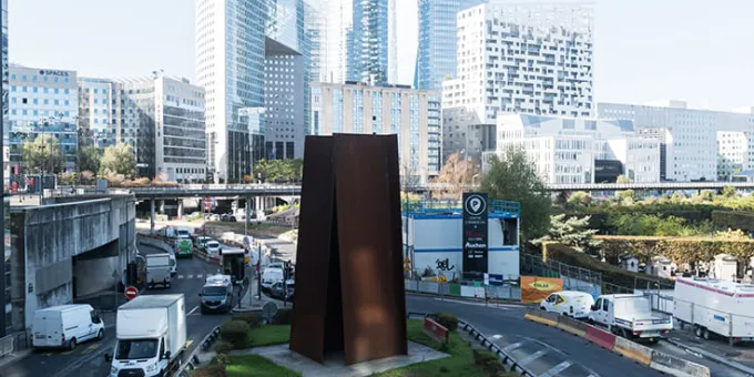 Slat, feuille de métal en anglais, est composée de cinq plaques d’acier de 25 tonnes chacune, qui s’érigent jusqu’à 12 mètres de haut. De l’extérieur, la sculpture est composée de 4 plaques disjointe en forme de trapèze. En pénétrant dans la sculpture par une des deux entrées, une cinquième plaque apparaît et dessine deux parties inégales. La découverte de l’œuvre est indissociable du mouvement du spectateur qui se déplace autour et dans la sculpture sans jamais pouvoir l’appréhender dans sa totalité.
