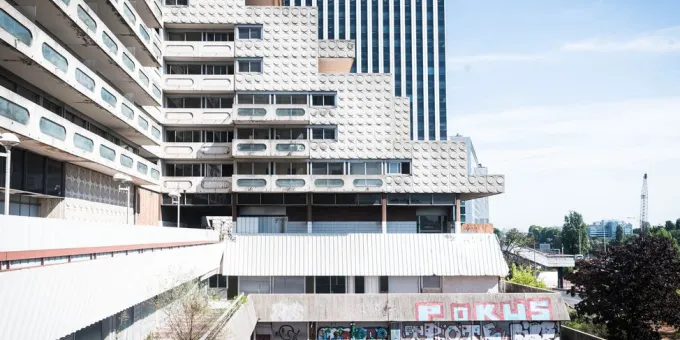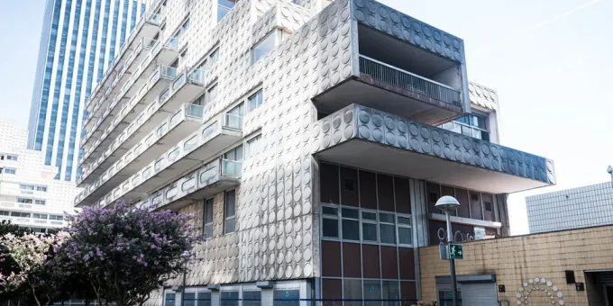 Le problème de la densification est résolu par la mise en place d'une dalle exclusivement piétonne permettant de dissimuler un parc de stationnement de près de 2 400 places. Les volumes en forme de pyramide facilitent l'éclairage naturel jusqu'aux niveaux inférieurs réservés aux commerces de proximité. Les 25 000 m² de façades sont ornées de panneaux préfabriqués de béton au motif circulaire en creux et relief.