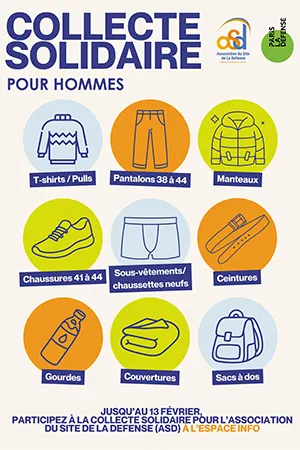 Making a donation couldn't be easier! Simply drop your items into the large box provided at the Espace Info Paris La Défense. All donations will be collected and delivered in one go to the charity, which will then distribute them to those in need.