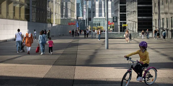 - aménager des espaces publics encourageant les mobilités douces et actives (voir le Plan vélo de Paris La Défense) ;