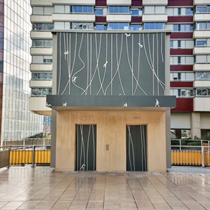 Dans le quartier Reflets, un édicule a été transformé en œuvre d’art ! Cette sortie piétonne du parking des Reflets a été habillée par Vincent Broquaire en octobre 2025. En passant devant, vous pourrez apercevoir de petits personnages, évoquant des agents d’entretien, mis en scène comme s’ils évoluaient tout autour de l’édicule. Ici, l’artiste joue avec la perception des passants grâce à des effets de mouvements.