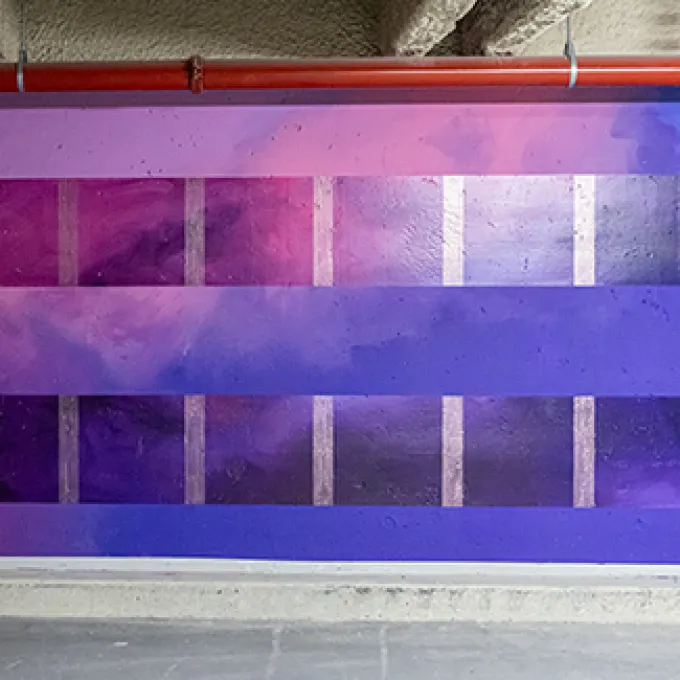 L’intérieur du parking Michelet n’est pas en reste ! En effet, l’artiste plasticienne Elsa Tomkowiak vient de revisiter tout un linéaire de 250 mètres de long en le transformant en une vaste fresque colorée et vivante, accompagnant les voitures de leur entrée jusqu’à leur sortie. Ces multiples nuances de couleurs permettent de transformer cet espace gris, d’accompagner les usagers dans un trajet vibrant et joyeux, tout en devenant un outil de signalétique efficace. En effet, chacune des 10 portes d’entrée est marquée par sa propre couleur.