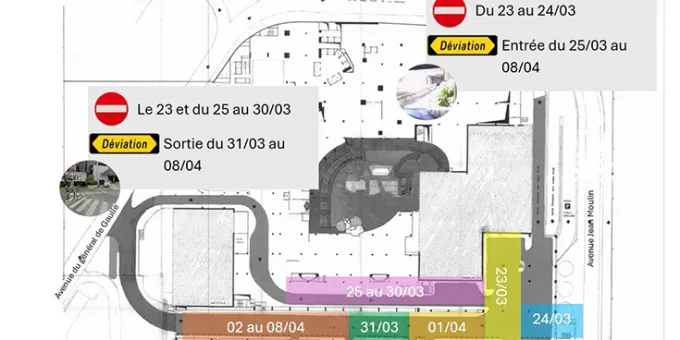 - Fermeture partielle de la voie et modification des sens de circulations à partir du 23 mars jusqu’au 9 avril 2026 (une déviation sera mise en place sur site - voir plan au dos)