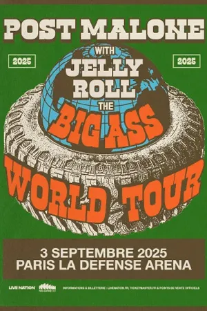 À l’occasion de son « Big Ass World Tour », le légendaire Post Malone revient en France le 3 septembre 2025, pour enflammer Paris La Défense Arena accompagné de Jelly Roll ! Un combo gagnant très prometteur à ne manquer sous aucun prétexte !
