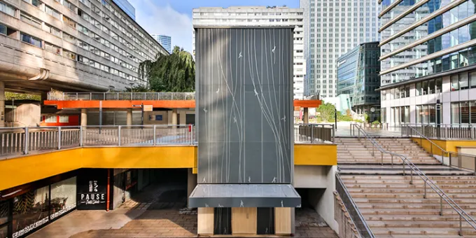 Situé dans le quartier Reflets, l’œuvre Apseil habille l’édicule du parking Q-Park. La pierre grise, devenue la toile de Vincent Broquaire, amène un supplément d’âme au quartier récemment réhabilité.
