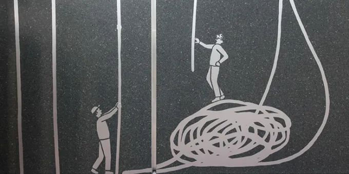 Dans cette œuvre, l’artiste joue avec la perception du spectateur en improvisant une scène qui donne une sensation de mouvement. En s’appuyant sur un support déjà existant, Vincent Broquaire donne vie à de petits personnages, évoquants des agents d’entretien, qui se balancent avec légèreté et humour, créant l’illusion qu’ils montent et descendent au rythme des ascenseurs qu’ils cachent.