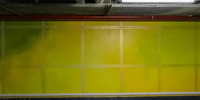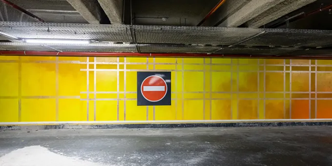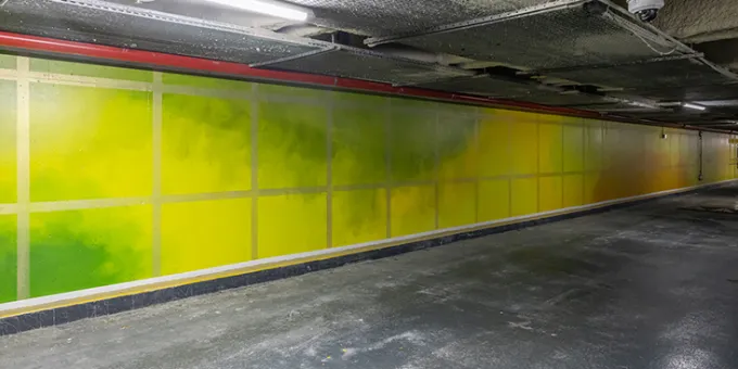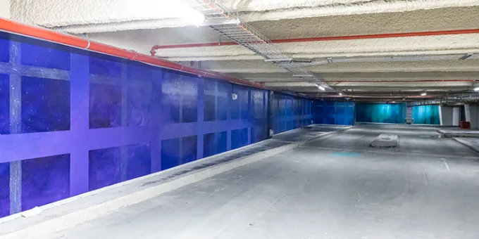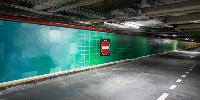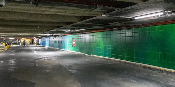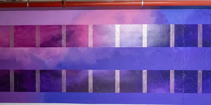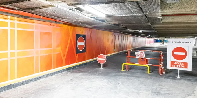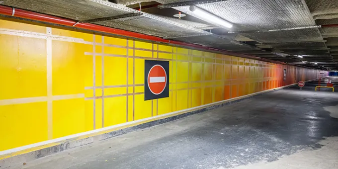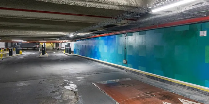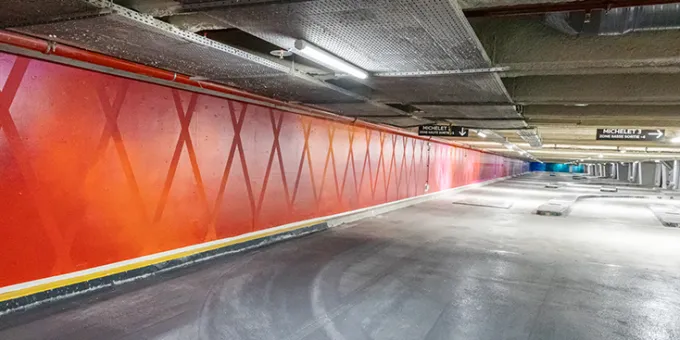 Cette fresque murale de 250 mètres de long se situe au -3 du parking Michelet, dans le quartier éponyme. Nommée « Les Frontispices » par sa créatrice, Elsa Tomkowiak, elle accompagne les visiteurs dès leur entrée et jusqu’à leur sortie du parking, en les plongeant dans un parcours coloré, vivant et contrasté. Cette peinture monumentale, horizontale et panoramique, est un véritable dégradé chromatique inspiré du spectre lumineux, passant des tons froids aux nuances plus chaudes, du bleu ciel au rouge flamboyant, et formant ainsi une boucle continue. Ces teintes vives contrastent avec l’environnement gris du lieu et permettent d’identifier plus précisément les 10 portes d’accès au parking, chacune associée à une couleur différente. Enfin, les variations rythment l’expérience du spectateur et se révèlent par un jeu subtil de surfaces mates, satinées et pailletées, perceptibles selon l’angle de vue, la lumière ou sa vitesse.