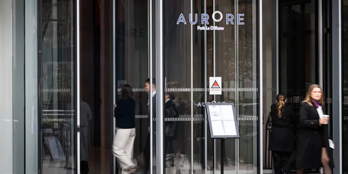 Alors qu'à La Défense, les tours sont conçues selon un gabarit unique, les architectes font le choix de façades horizontales pour la tour Aurore. Solution qui consiste à accentuer les niveaux par des allèges pleines en béton préfabriqué et des bandes vitrées continues, de teinte cuivrée. L'absence de points porteurs permet par ailleurs d'exploiter ce parti. Partiellement rénovée en 1993, la tour Aurore va laisser place à la nouvelle tour Aurore prochainement.