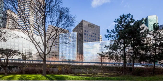 Le projet est toutefois repris par Michel Andrault et Pierre Parat, fraîchement arrivés dans le quartier d’affaires. Il se présente alors sous la forme de volumes différents jouant avec les coloris argenté et noir des ossatures des façades et des vitrages.